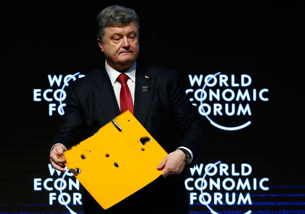 Порошенко привез в Давос кусок автобуса из Волновахи Президент Украины заявил, что на территории Украины 9000 российских военнослужащих, призвал вывести их и закрыть границу с Россией