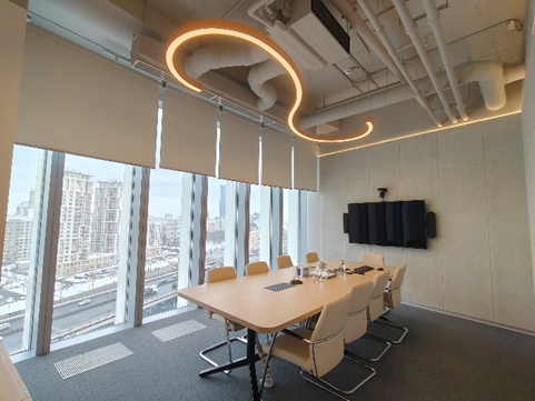 - Нестандартные подвесные световые системы, с использованием комбинации «светильник + акустика = подвесной элемент» используются и в переговорных комнатах различного формата, и в рабочих кабинетах различных подразделений компании.