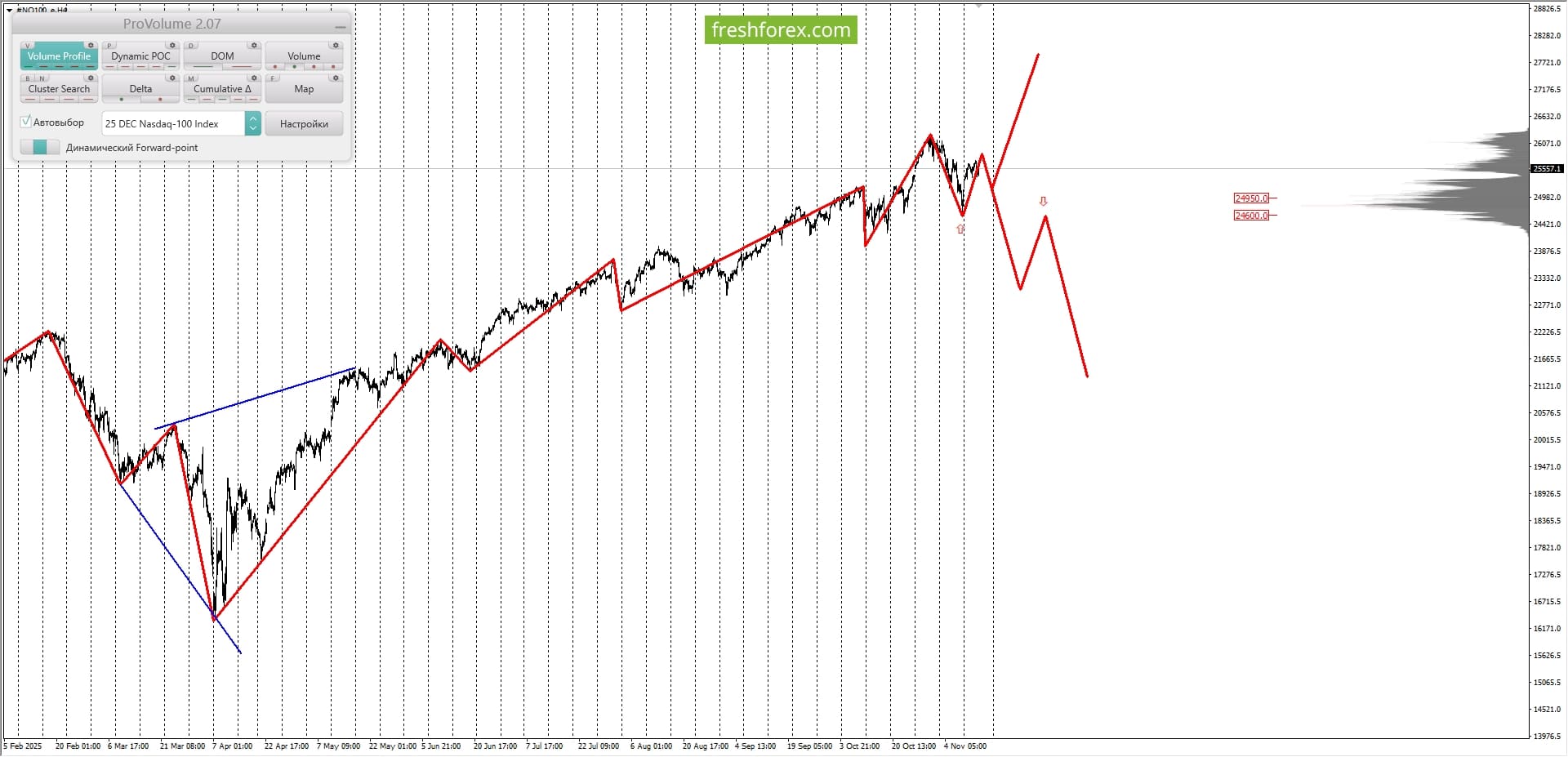Долгосрочная тенденция: в лонг. Максимальное скопление объемов текущего контракта расположено в диапазоне, по котировкам 24600.0–24950.0. В настоящий момент по #NQ100 совершаются инвестиционные операции выше указанного диапазона, что говорит о силе покупателей.