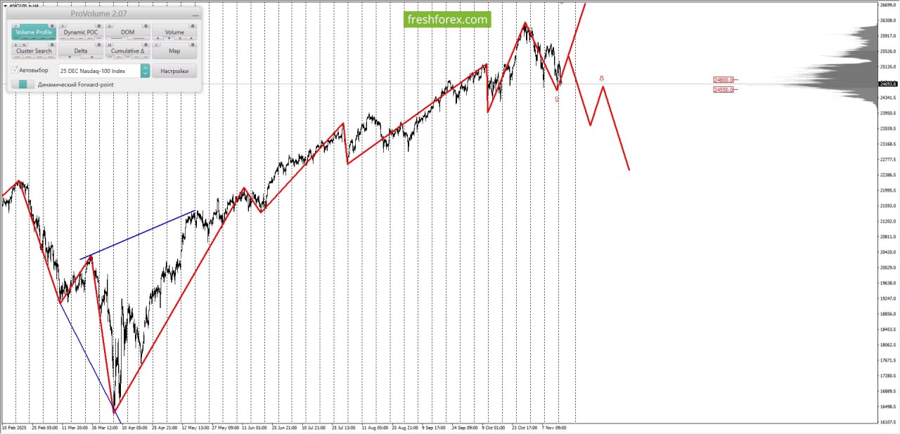 • Среднесрочная тенденция: в шорт. Максимальное скопление объемов среднесрочной тенденции расположено в диапазоне, по котировкам 25460.0–25540.0. В настоящий момент по #NQ100 совершаются инвестиционные операции ниже указанных диапазонов, что говорит о силе продавцов.