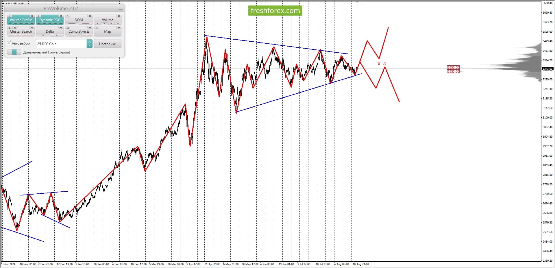 • Среднесрочная тенденция: в шорт. Максимальное скопление объемов среднесрочной тенденции расположено в диапазоне, по котировкам 3358.00–3365.00 и 3337.00–3345.00. В настоящий момент по XAUUSD совершаются инвестиционные операции внутри указанного диапазона, что говорит о временной неопределённости.