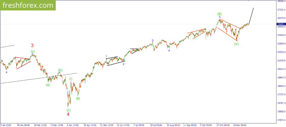 Индекс продолжает свое неспешное но уверенно движение вверх. Каждый шаг приводит к обновлению исторического максимума. Но в данный момент движение, вероятно, идет в рамках формирования заключительной волны 5 восходящего импульса. Это указывает на то, что в скором времени нас, вероятно ожидает разворот и хорошее нисходящее движение, в рамках формирования коррекции, или нисходящего импульса.