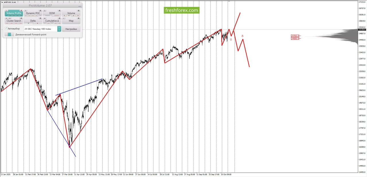 • Долгосрочная тенденция: в лонг. Максимальное скопление объемов текущего контракта расположено в диапазоне, по котировкам 24550.0–24800.0. В настоящий момент по #NQ100 совершаются инвестиционные операции внутри указанного диапазона, что говорит о временной неопределённости.