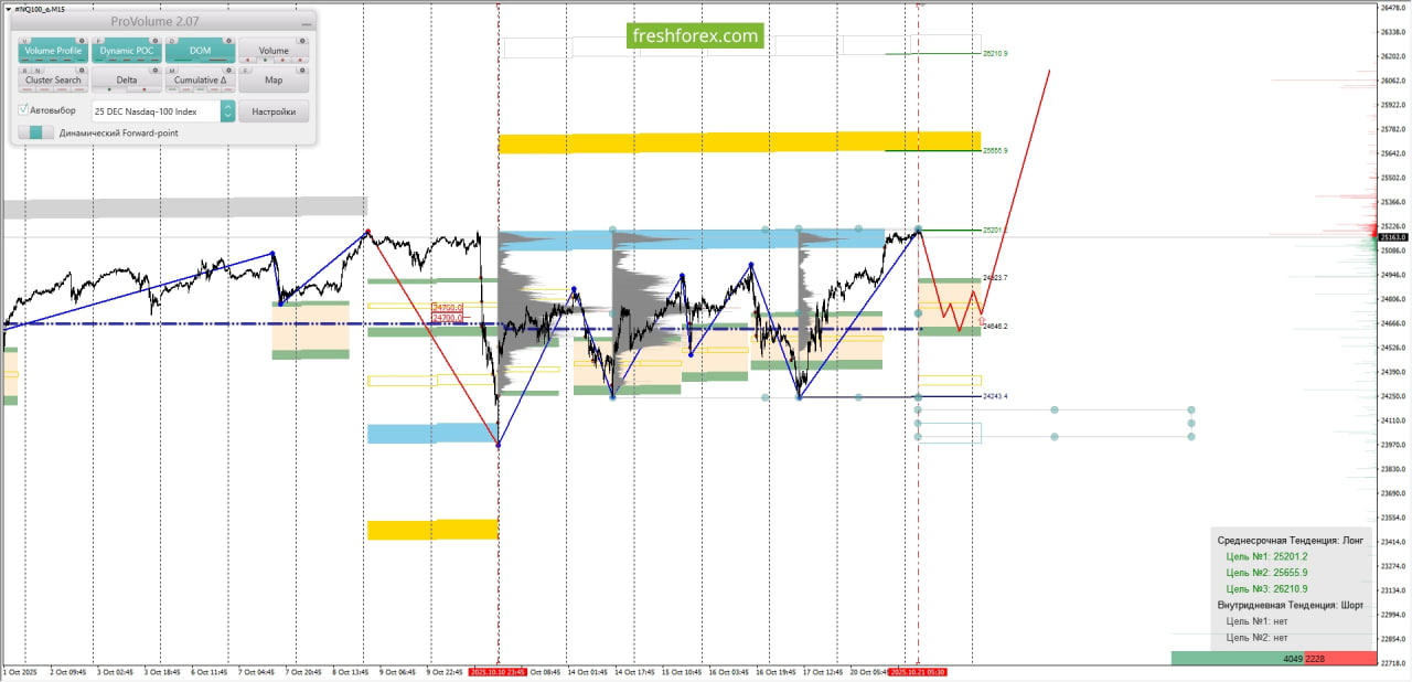 • Среднесрочная тенденция: в шорт. Максимальное скопление объемов среднесрочной тенденции расположено в диапазоне, по котировкам 25460.0–25540.0. В настоящий момент по #NQ100 совершаются инвестиционные операции ниже указанных диапазонов, что говорит о силе продавцов.
