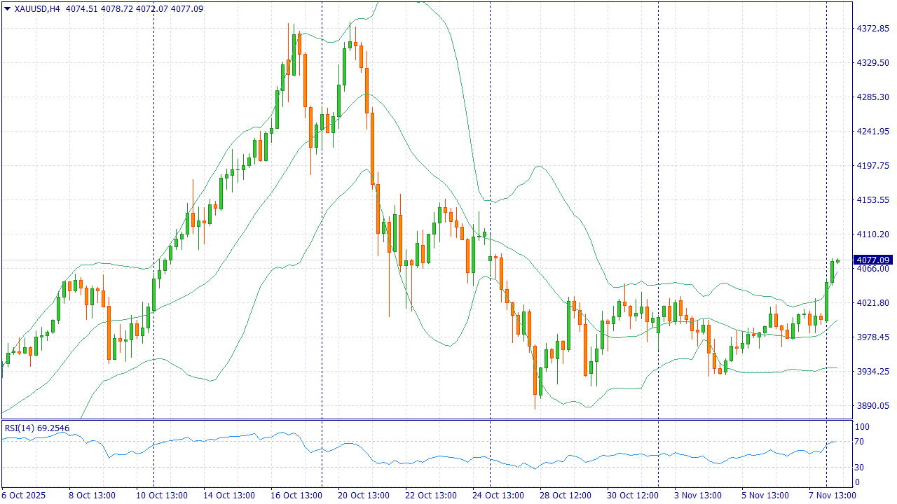 Золото входит в неделю на повышенных уровнях: рынок усилил ожидания снижения ставки ФРС в декабре и одновременно следит за ходом решения бюджетного кризиса в США. Рост вероятности смягчения политики и сохраняющаяся неопределённость по темпам экономики поддерживают спрос на защитные активы. Дополнительно помогает постепенное восстановление интереса со стороны фондов и устойчивый спрос со стороны центробанков, тогда как доходности гособлигаций США остаются волатильными, но без нового рывка вверх — это снижает «стоимость хранения» золота и поддерживает котировки.