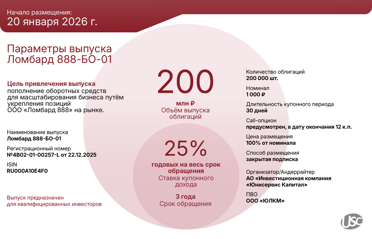 Размещение дебютного облигационного выпуска ООО «Ломбард 888» начнётся 20 января 2026 года.