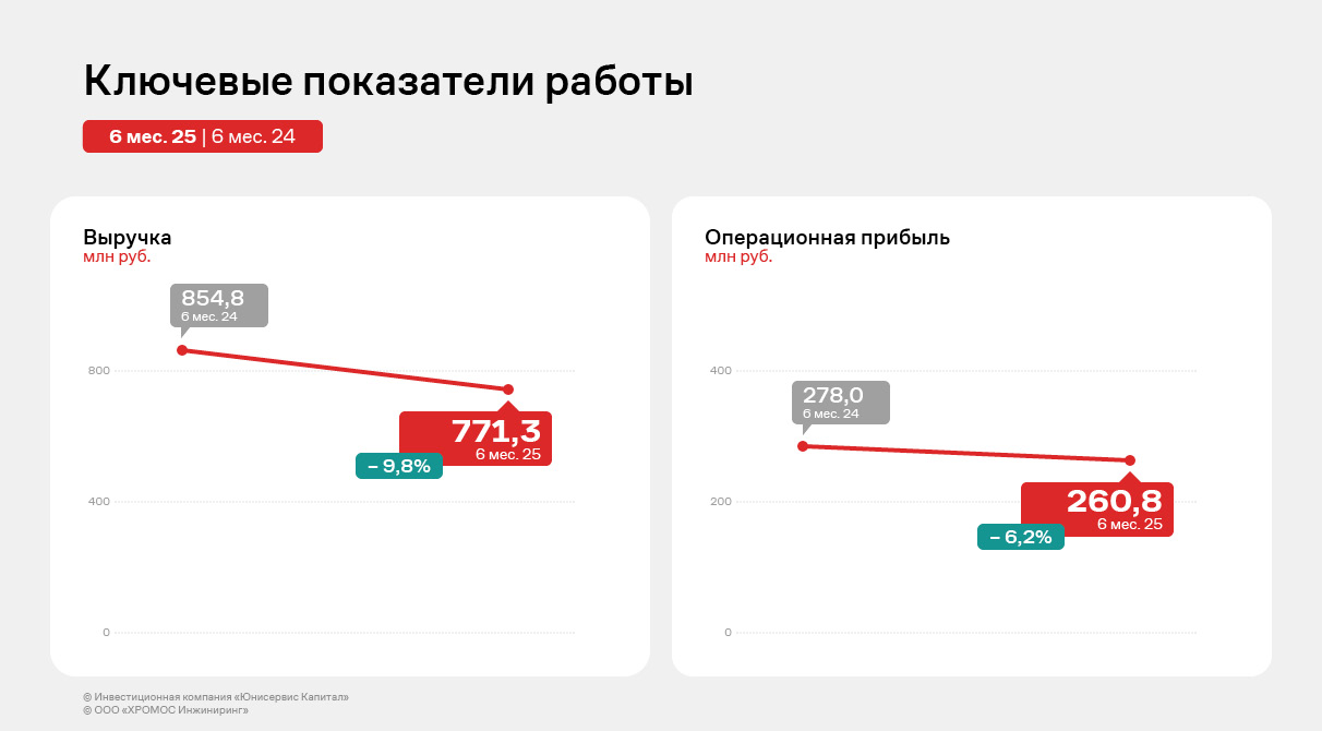 Эмитент отмечает изменения на рынке хроматографии в первой половине 2025 года. Явно оформилась тенденция к снижению государственных закупок аналитического оборудования. Компания вовремя отреагировала на переход крупнейших игроков нефтегазового сектора на потоковые хроматографы, что позволило «Хромос Инжиниринг» изменить структуру выручки и сохранить обороты на уровне 2024 года.