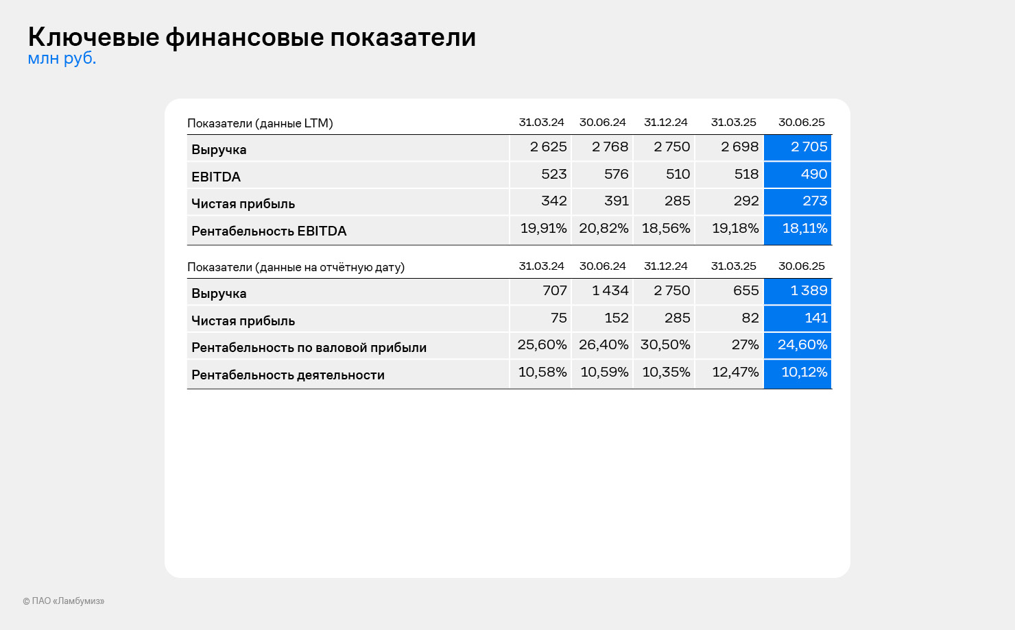 Ранее «Ламбумиз» представил финансовые итоги 1 квартала 2025 года. Выручка компании на 31.03.2025 за предыдущие 12 месяцев (LTM) составила 2,7 млрд руб., что на 3% больше значений за аналогичный период прошлого года (АППГ). Компания продолжила оптимизировать свои затраты: валовая прибыль LTM составила 835,8 млн руб., что на 8% больше АППГ, EBITDA осталась на уровне 517,5 млн руб.