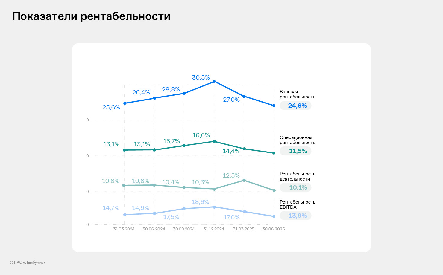 Валовая рентабельность остается на высоком уровне (24,6%), однако заметно снижение относительно среднего уровня 2024 года. Тем не менее, благодаря мерам по оптимизации затрат, рентабельность EBITDA сохраняется на уровне 13,9% на отчетную дату.