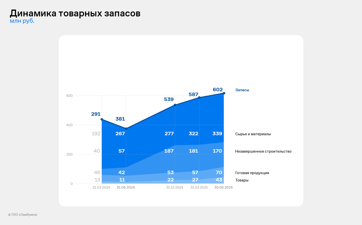Запасы увеличились на 63 млн руб., или 12%, к данным 2024 года и составили 602 млн рублей. Такая динамика обусловлена в первую очередь наращиванием объема производства картона и ламинированного картона, прирост которого составил 23% к данным 2024 года. Оборачиваемость запасов составила 73 дня, незначительно увеличившись на 7 дней по сравнению с 1 кварталом.