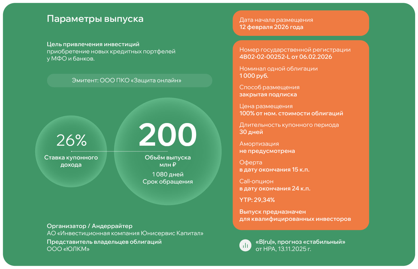 Компания намерена разместить биржевые облигации общим объёмом 200 млн руб. под 26% годовых - ставка определена на 15 купонных периодов с возможностью её пересмотра накануне запланированного put-опциона. Также предусмотрен опцион сall в дату окончания 24 к.п. YTP составляет 29,34%.