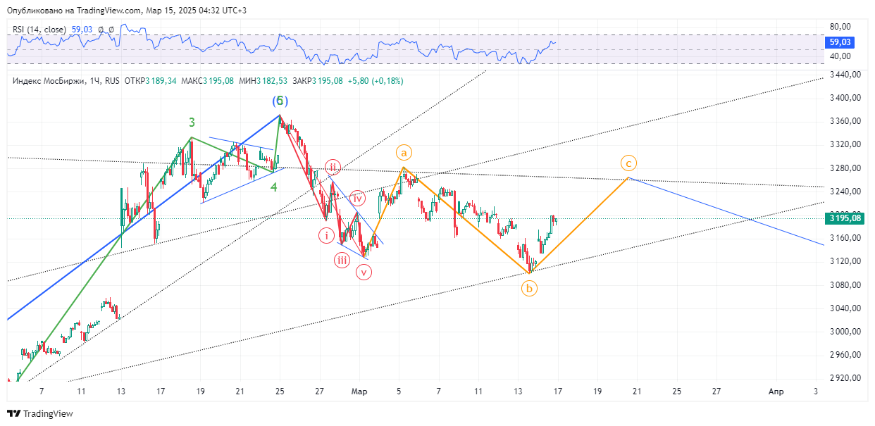 02.03 я писал, что с 03.03 нас ждёт период роста в виде коррекции, которая закончится 13.03. По факту видим, что коррекция продлится дольше, т.к. 13.03 рынок развернулся не вниз, а вверх, закончив только волну B.