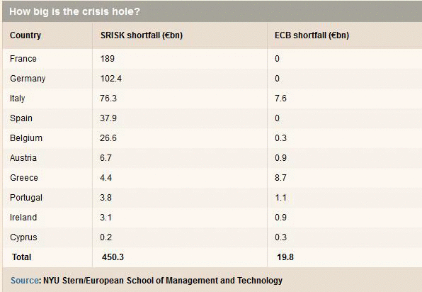 Используя свою методику, которая называется SRISK, Ачарая сделал вывод, что в случае наступления нового кризиса дефицит капитала во всех французских финансовых институтах может составить почти 400 млрд евро, и это будет значительно хуже, чем в банках США и Великобритании, чей финансовый сектор намного больше. Если рассматривать только те французские банки, которые принимали участие в тестировании ЕЦБ и дефицит капитала которых оказался нулевым (по оценке ЕЦБ), то в случае применения методологии SRISK их дефицит капитала составил бы 189 млрд евро.